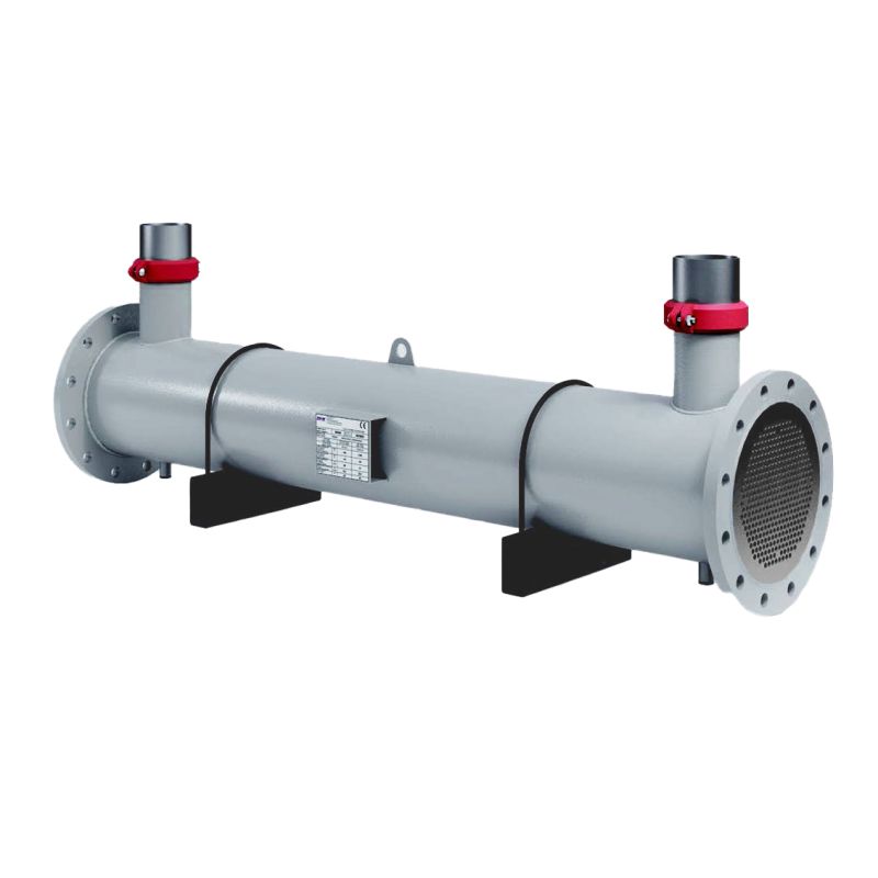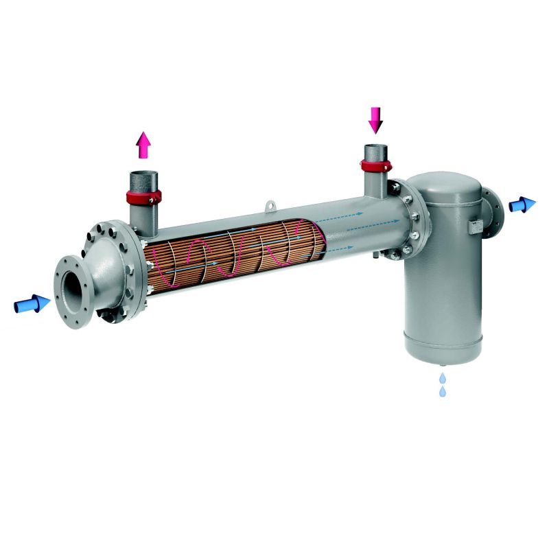Compressed air flows through a bundle of smooth copper tubes housed in a steel shell. Chilled water is injected in counterflow around the tubes, guided by baffles to ensure full surface contact. The water absorbs the heat from the air and exits the separator warmed, ready to be cooled again by a refrigeration system (cooling tower or chiller unit).
